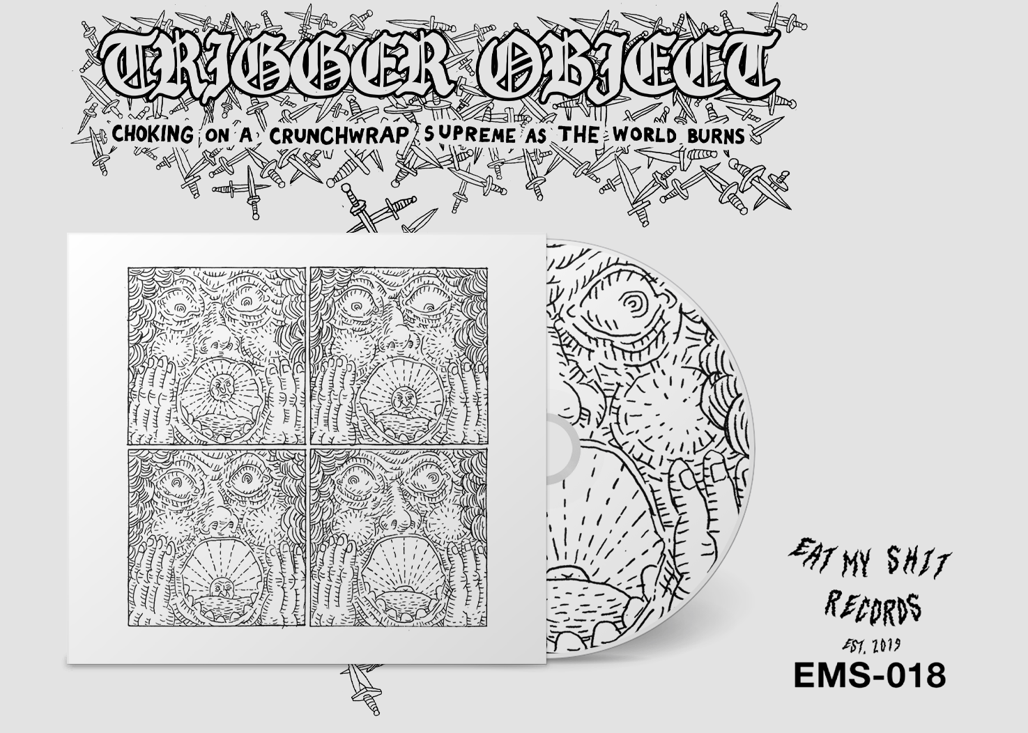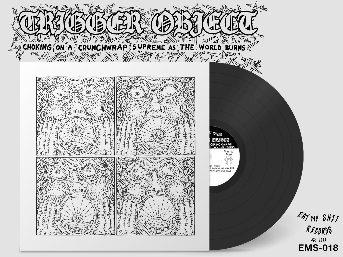 “Choking On A Crunch Wrap Supreme As The World Burns” brings us Trigger Object at the peak of mastery, channeling and fermenting our collective and individual disgust for the state of the world into a noise seance. The project makes gifts of Trigger Object’s observations in the face of general obliviousness to crisis—a careful record of all that we block out. Her field recordings bring in children playing on a playground in an active, taped-off crime scene; a murder of motorcycles revving on a city street; an afternoon at Best Buy when every alarm in the store went off at once but business continued as usual; a machine slamming a hole into her basement to release poisonous radium decay. Synthesizers add hyperreal texture: duck tape ripped off a mouth.